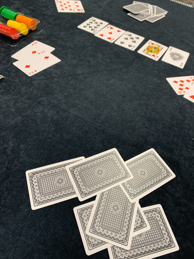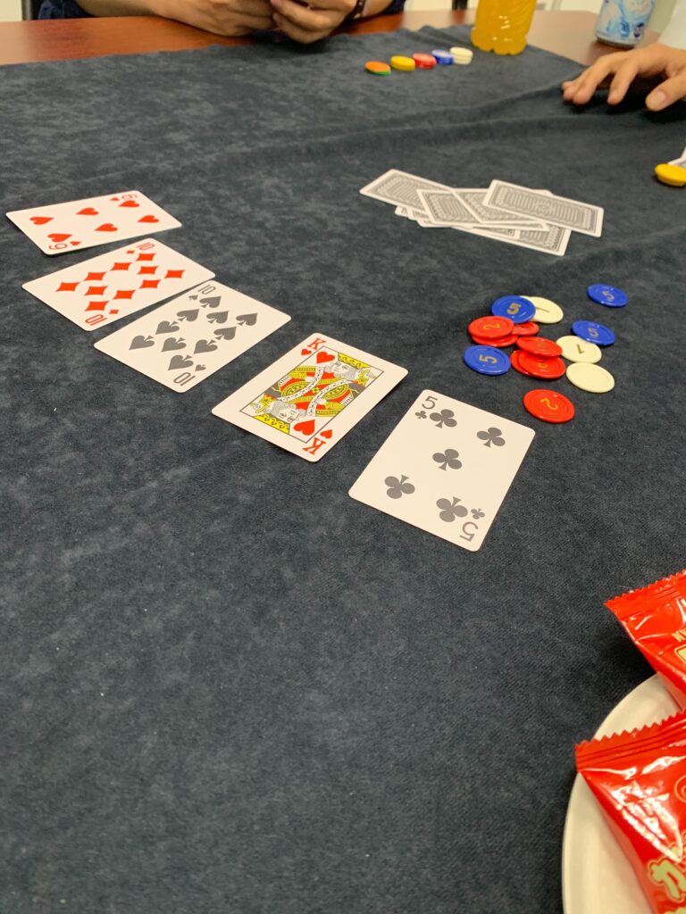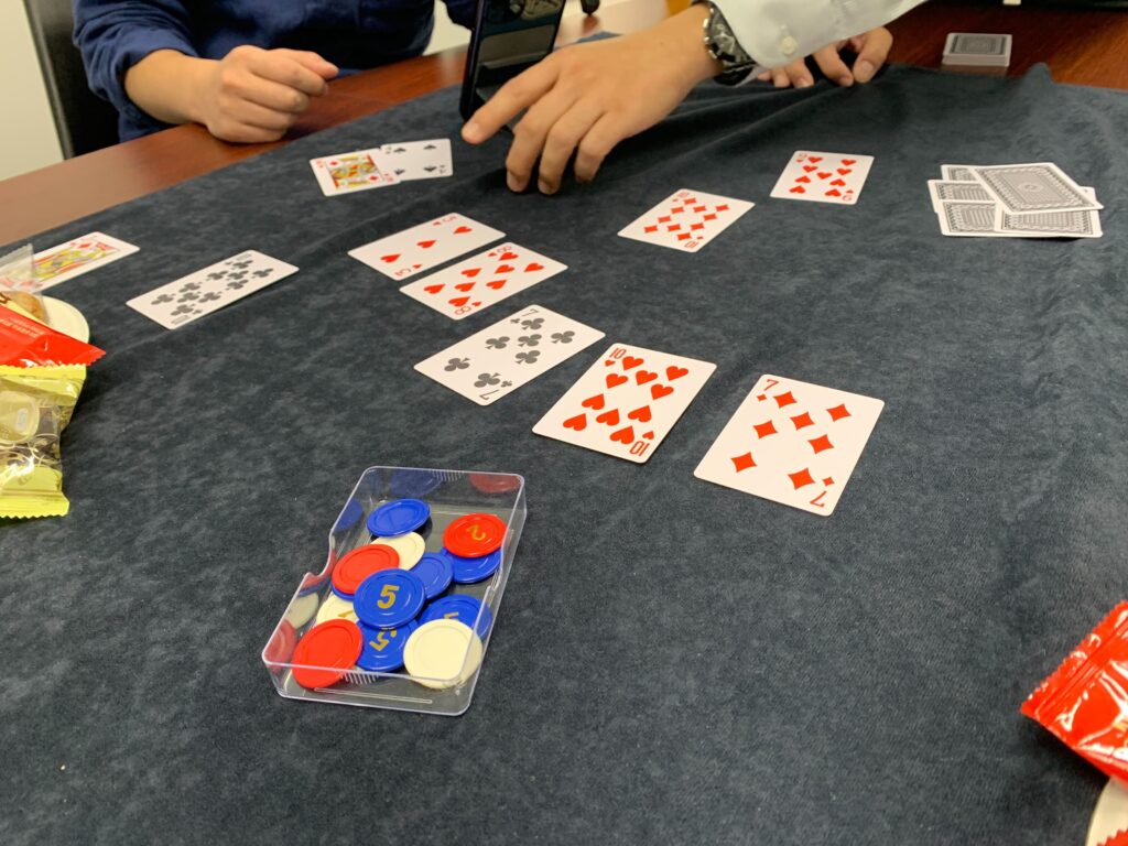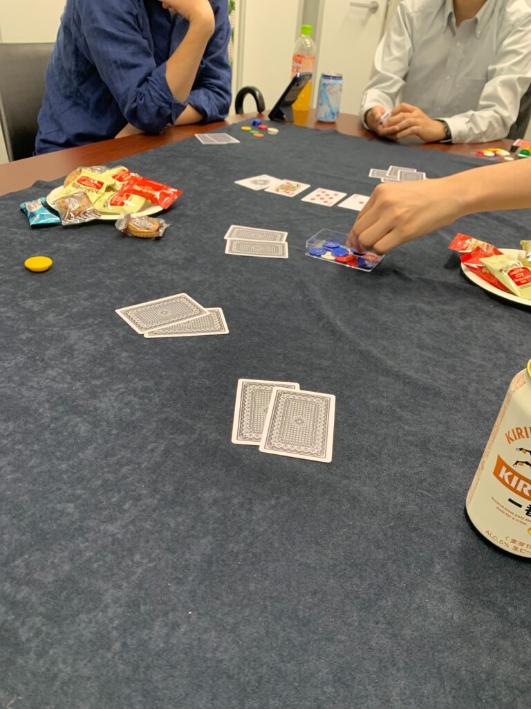 今回は、『テキサスホールデム』、カジノでは一番一般的なポーカーゲームです!自分の手持ちの札2枚と場に出ている5枚のカードを使って強い役を作ります。今回は、「ポーカーの役は辛うじて把握している or テレビゲームでやったことがある」程度の知識のメンバーでプレイしました!