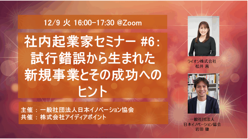本セミナーでは、実際に、大手企業で新規事業の立ち上げに取り組んでいる方をゲストにお招きしてアイディアの発想から、社内起業のきっかけ、どのように事業を立ち上げているのか、その経験をお伺いします。