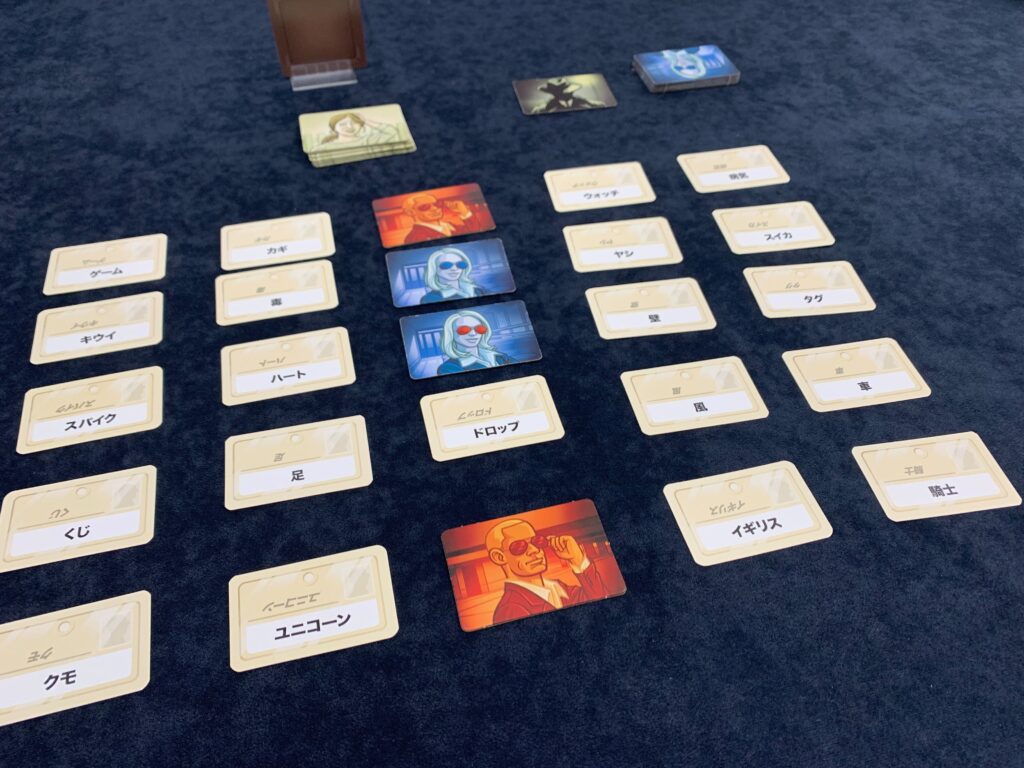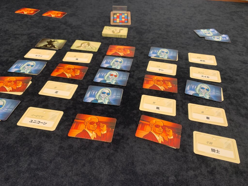 今回は、続いて『コードネーム』です。このゲームは赤陣営と青陣営に分かれて、ヒントから正解の言葉をみつけるゲームです。ヒントの出し方、当て方がおもしろいところです。最初に5×5枚並べて、エージェントマスターのヒントをもとにエージェントが自陣営の言葉をあてていきます。こんな雰囲気です。