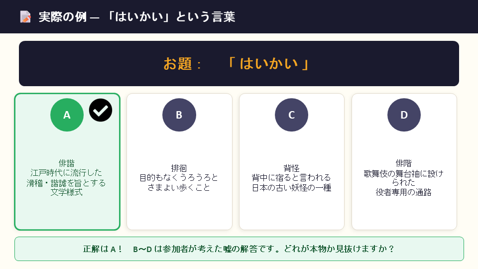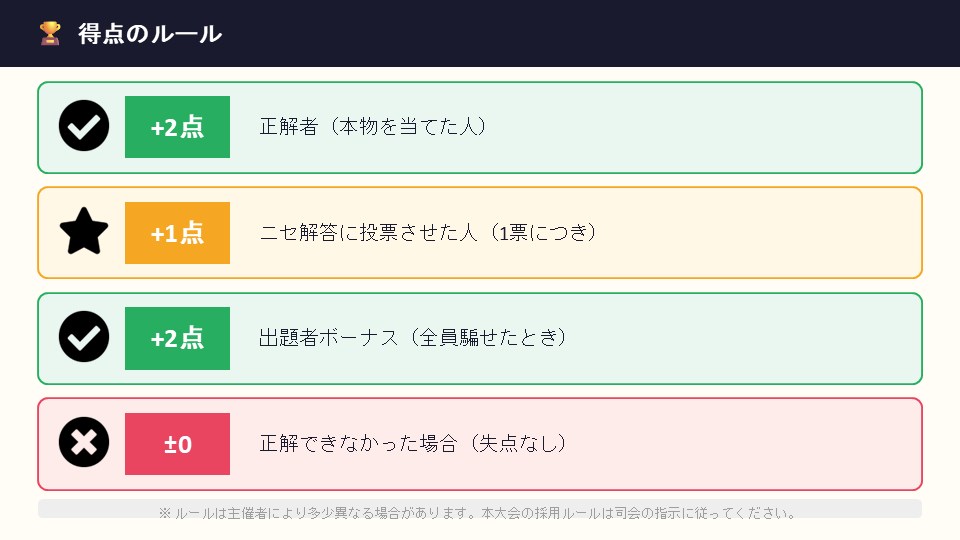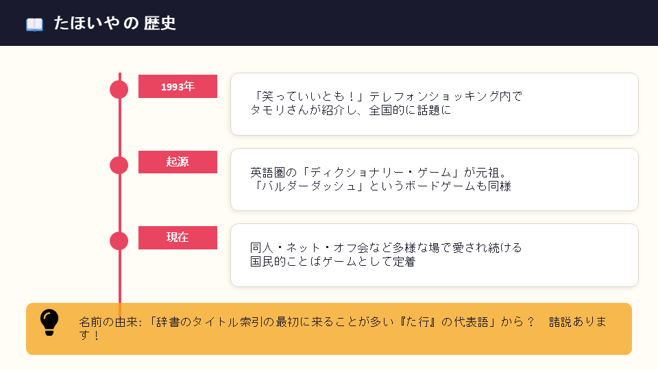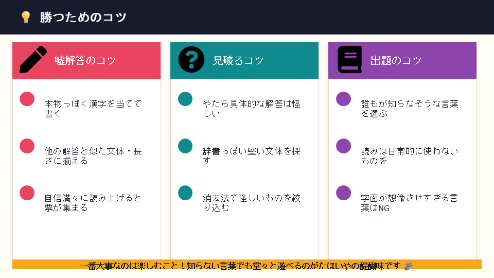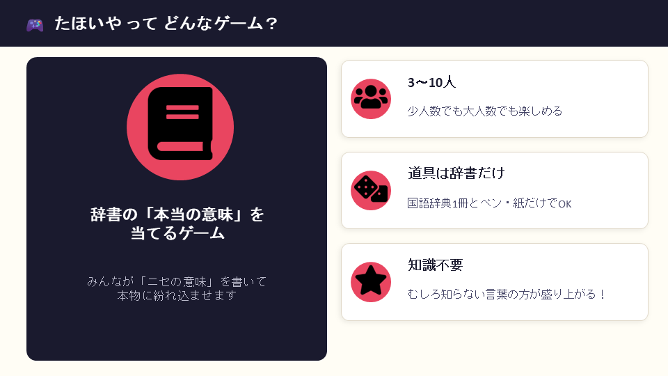 今回、ゲームの説明はClaudさんに作成依頼。ちょこちょこ間違ってる気もするが… ちなみに、「たほいや」は、典型的な「音がおもしろいけど意味のわからない」言葉の代表ですね。『静岡県などの方言で「イノシシを追い立てるための小屋(遣小屋、やらいごや)」を意味します』とのことでした。得点の仕方も少し微妙だったので、変更して実施しました。それでは、スタート!
