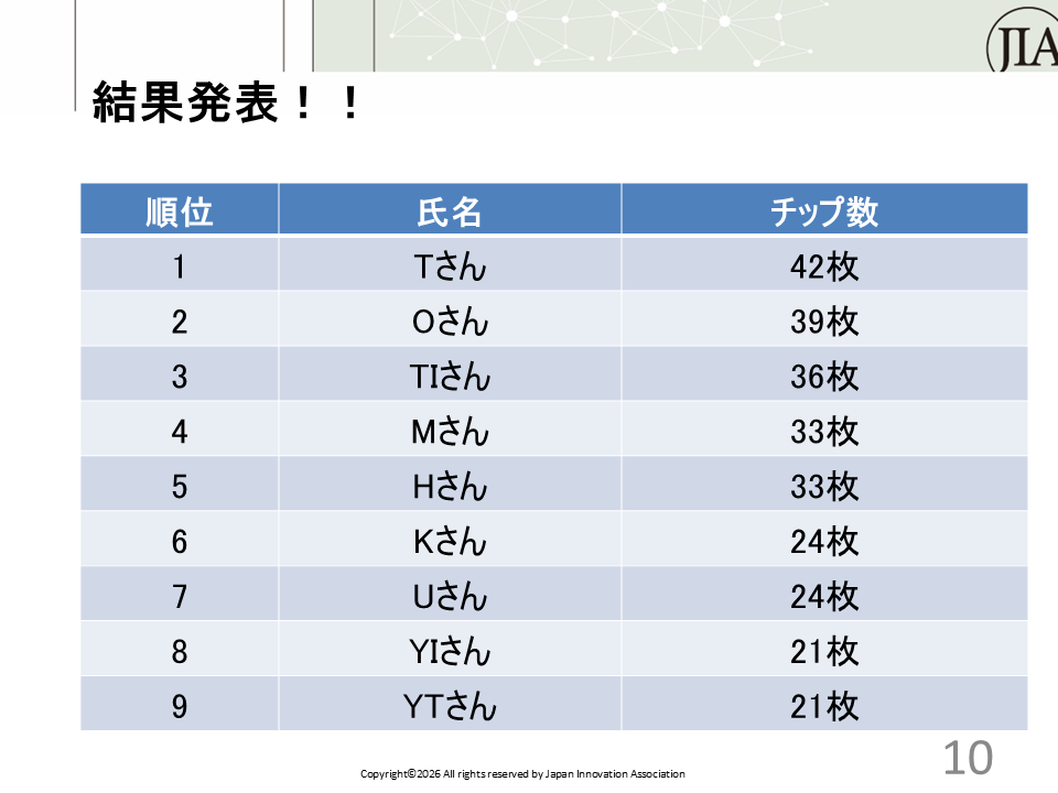 結果発表!今回は、Tさんの勝利!パチパチ。やはり、親の総取り+地道にナイスな解説で溜めていたのが強かったか。ナイスプレイ!