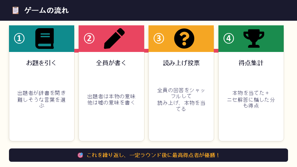 たほいやは、昔、フジテレビの深夜番組でやっていましたが、覚えている人もいるのではないでしょうか。40-50代の人限定ですが。英語圏では、フィクションとディクショナリーを足して、フィクショナリーという名称で親しまれています。親が辞書からお題を考えて子が当てます&それっぽい解説を考え他のプレイヤーを騙します。点数は、親は全外ししたら全員からチップもらえます。プレイヤー間でチップが移動するゼロサムのゲームです。