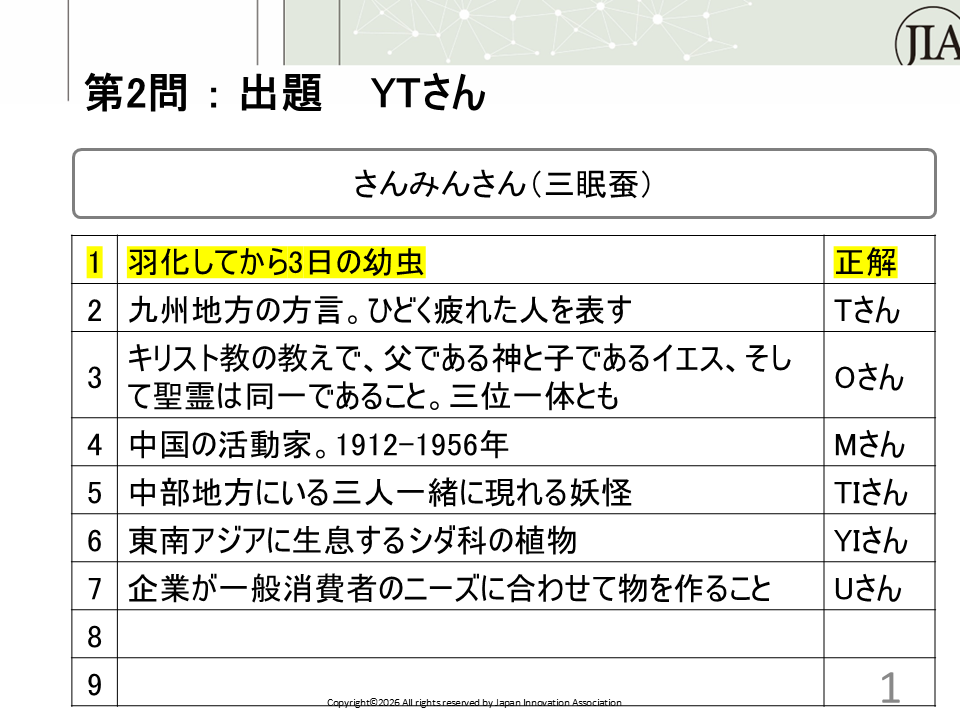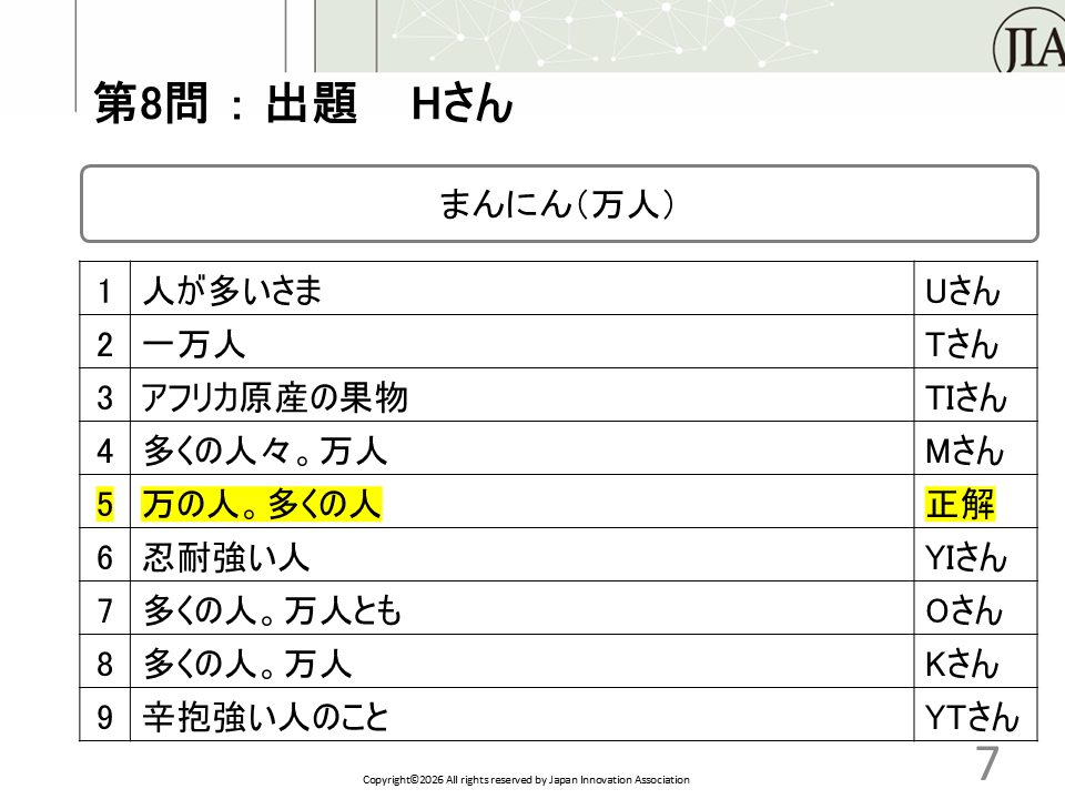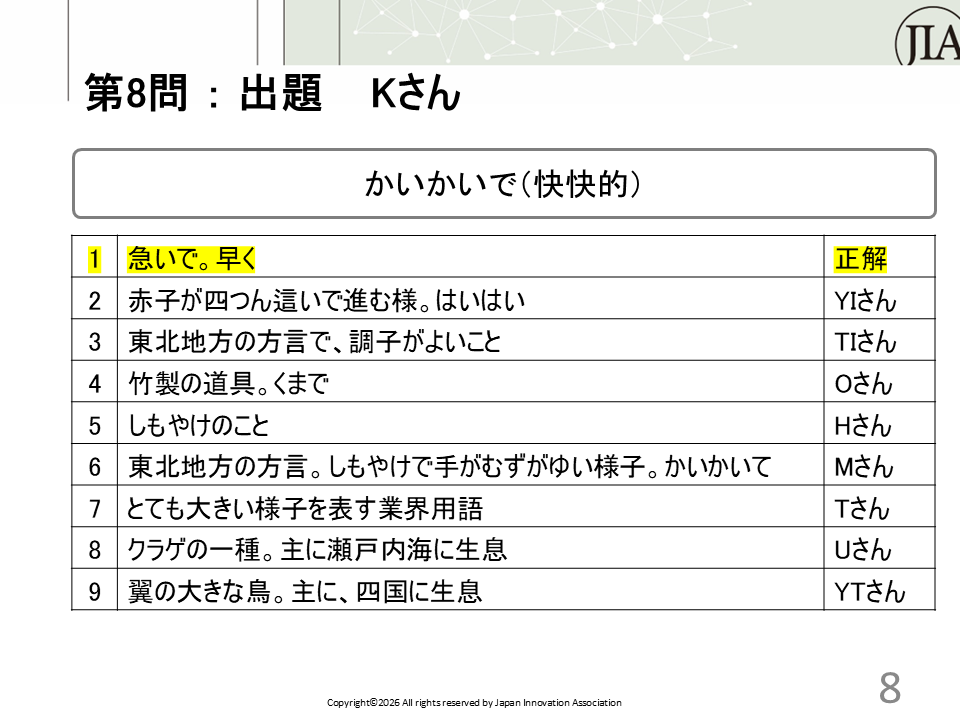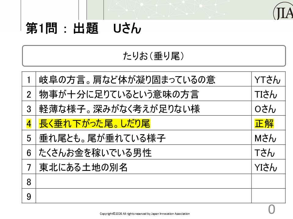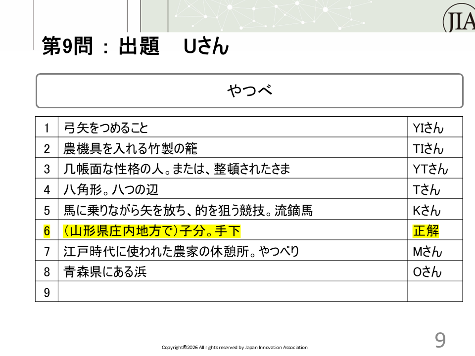 今回は9名で実施。↓こんな感じ。どれも実に味わい深い内容でした。スライドでは伝わりませんが、大盛り上がりです。人物、方言、道具、植物、面白いです。みんなキャッチアップが早いし、よく考えるなと感心しました。すばらしい!