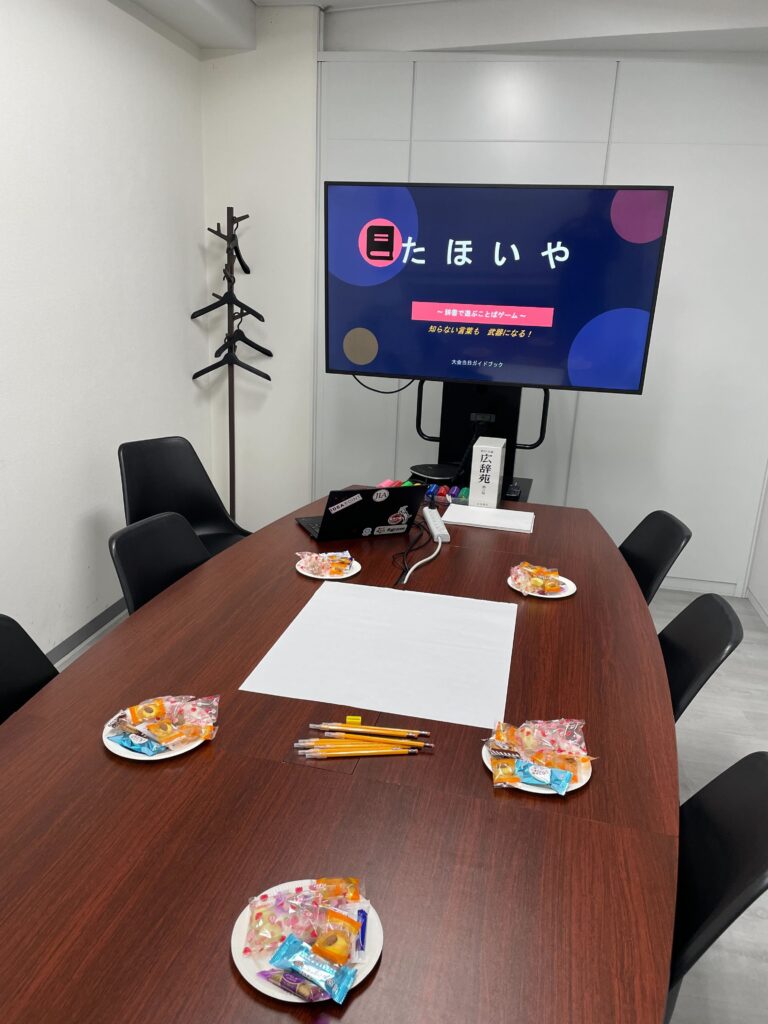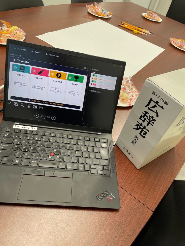 今回のゲームは広辞苑(辞書)と紙と鉛筆のみ!ということで、ほとんど準備なしです。現場の様子はこんな感じです。さぁ、盛り上がっていきましょう!